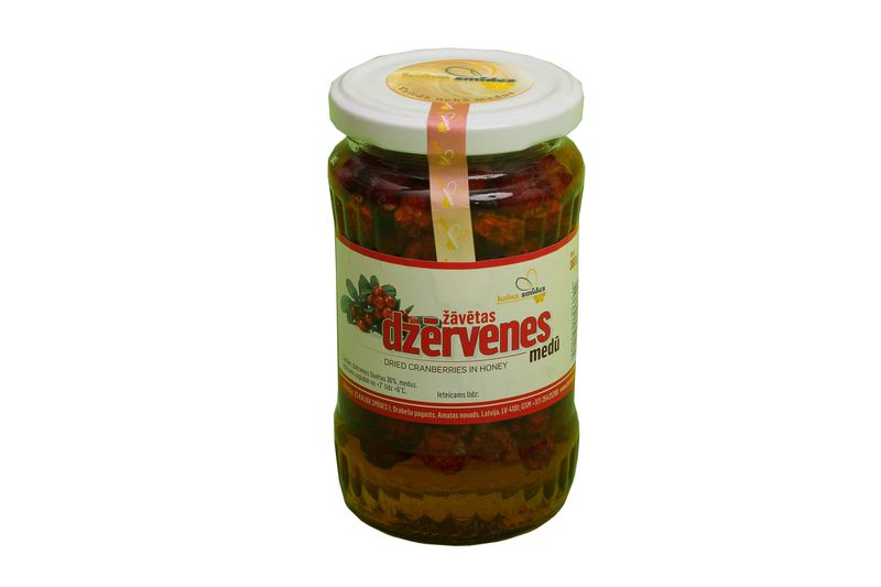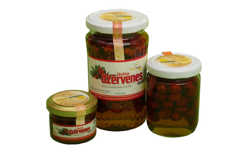 Dried cranberries in honey – from April through to September cranberries are usually unavailable and during that time they may be successfully substituted with dried cranberries which have been produced in Latvia by the farm of STRELNIEKI.